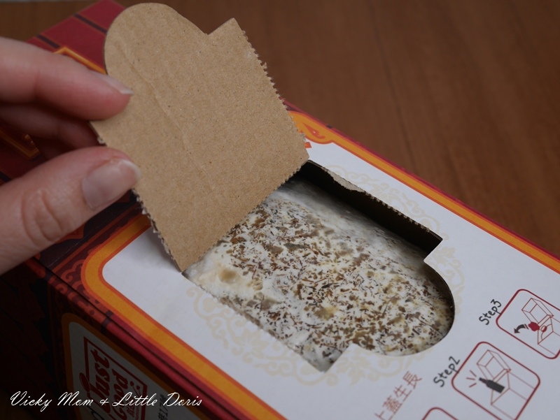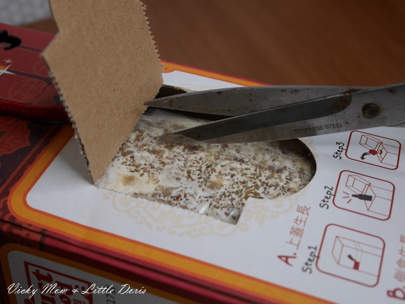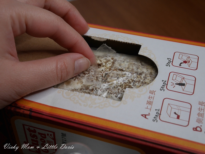 說明書也寫得相當清楚可以選擇從上面長出來或是側邊的開口,我們選了側邊生長,紙盒撕開後再用刀具小心的剪開一個十字,盡量不要傷到太空包裡的菌種哦~