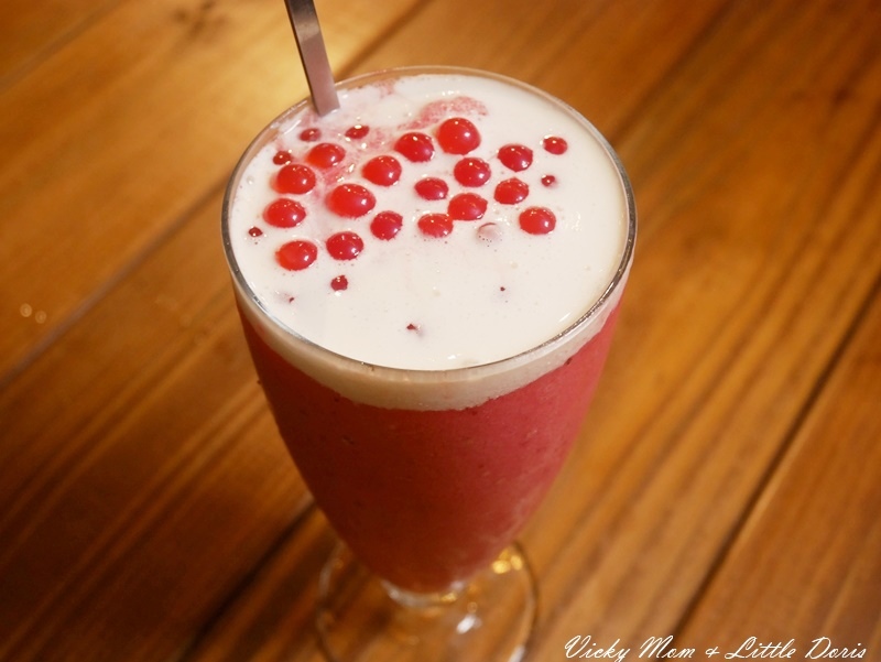 我點的是草莓芝芝冰沙裡面有像是果凍一樣Q彈的爆漿口感的爆爆珠