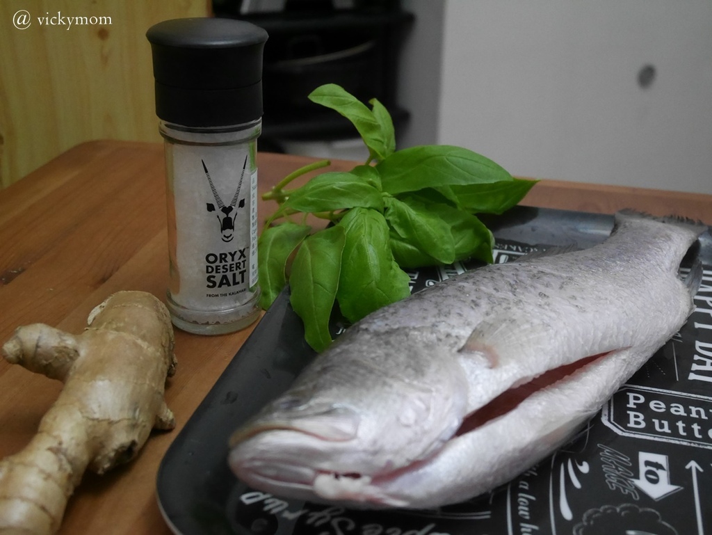 在鱸魚的肚子裡放入羅勒和薑片上面撒上一層劍羚沙漠塩